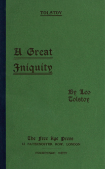A Great Iniquity is Tolstoy’s condemnation of war, state violence, and social injustice, especially in the context of early 20th-century Russia. He argues that the greatest evil lies in organized violence justified by governments, which corrupts both individuals and society. |